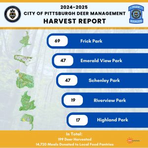 The targeted harvest was performed in March following the completion of the 2024-25 archery-controlled program. The archery program, which was launched during the 2023-24 deer archery season, permits certain archers to hunt deer in Pittsburgh parks, and is run by a collaborative effort between the City of Pittsburgh and the United States Department of Agriculture (USDA).