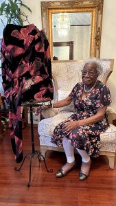 Always impeccably dressed for any occasion, Miss Amy also intended to create her own unique dress for her 100th birthday celebration. After designing and creating part of her newest dress with a dramatic butterfly design on rich velveteen fabric; Miss Amy said one night “she couldn’t sleep” and wondered whether she would finish the dress. Because “her hand doesn’t work” as well as it did and her vision is not what it was, Miss Amy said she relied on “God to help her make a decision” whether she was going to finish the dress. When she woke up the next morning (and with the help of God), she decided to buy a dress for her birthday celebration. Still determined, Miss Amy has total faith and confidence that she will “finish her dress” someday. In hearing what Miss Amy has accomplished in her lifetime, I too have total faith that she will complete that dress!