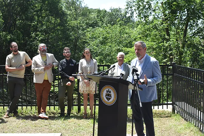 Mark Masterson, of Friends of Riverview Park, speaks ahead of the ribbon cutting. The group was a major advocate for the construction of the new bridge.