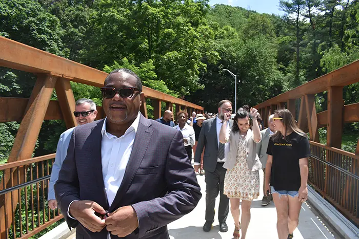 Mayor Ed Gainey leads attendees in a ceremonial first walk across the bridge. The crossing replaces a vehicular bridge which was demolished in 2009.
