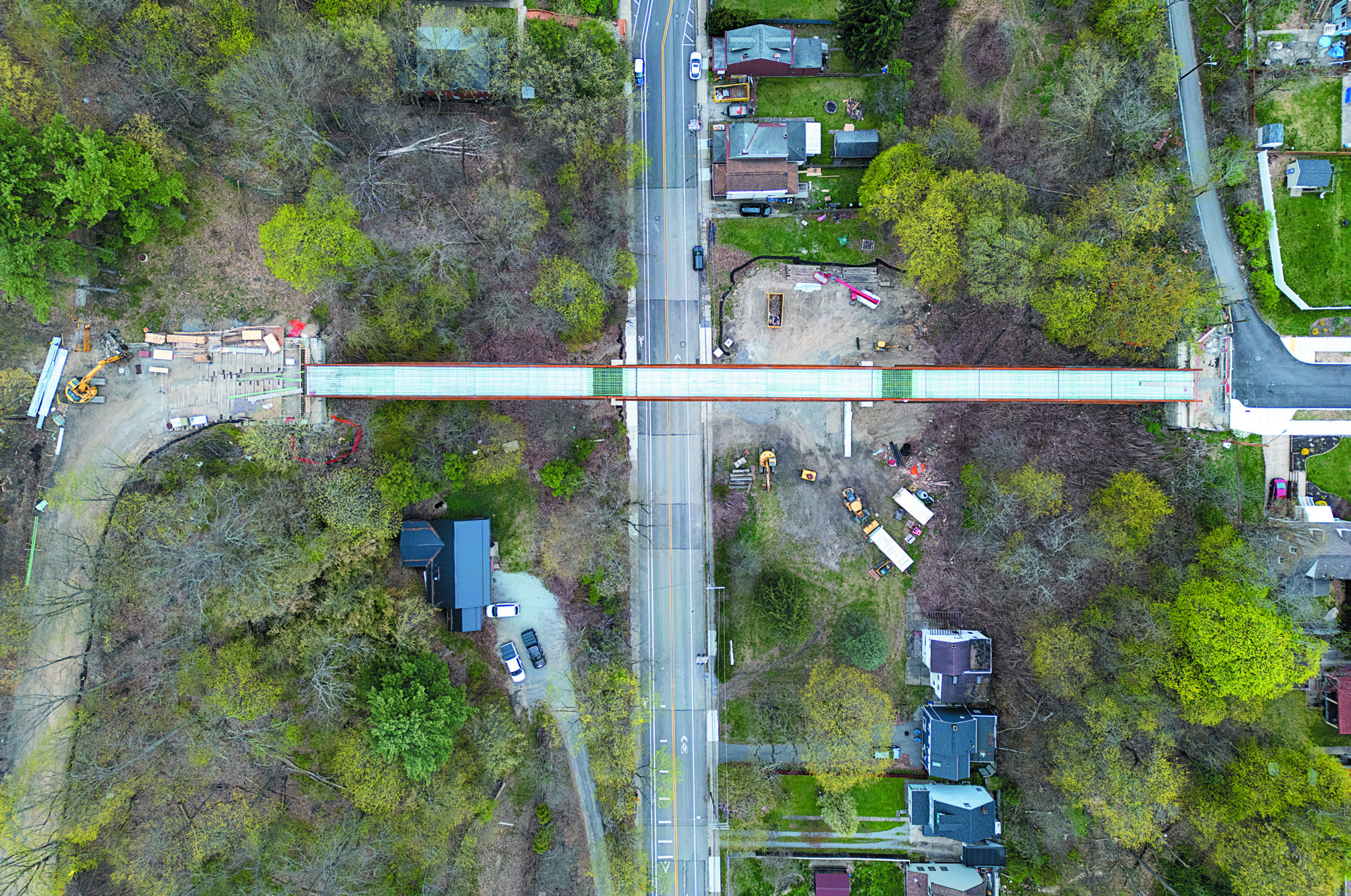 An aerial photo taken by a drone of the Davis Avenue Pedestrian Bridge while it was still under construction. The bridge replaced a vehicular crossing that was torn down in 2009.