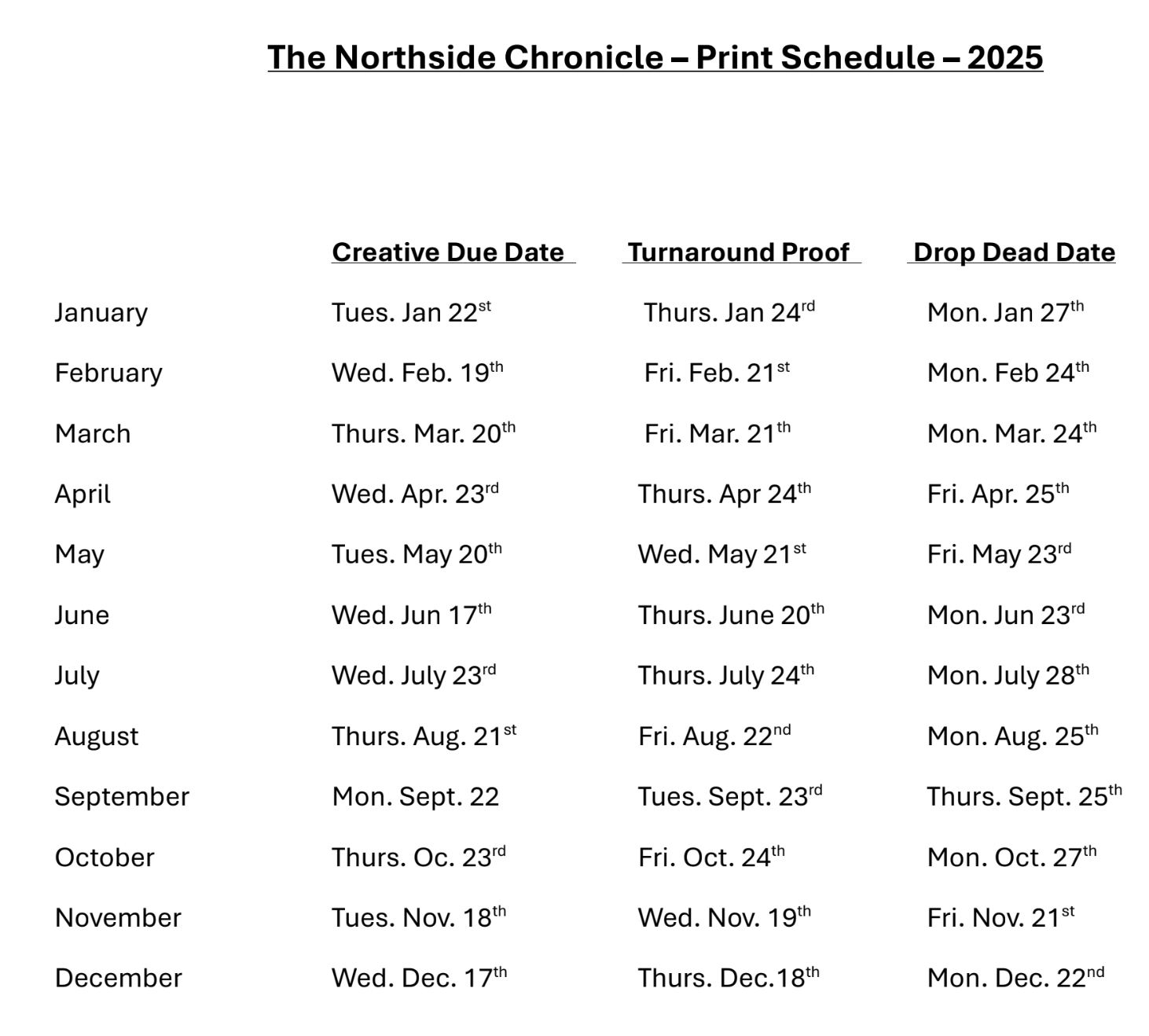 The NorthSide Chronicle is a trusted source of news for our local community, and advertising with us can provide your business with a platform to connect directly with potential customers in your area. Our readership is diverse and loyal, and they value supporting local businesses. Every month we distribute to 18 neighborhoods, 200+ locations including businesses, churches, and several newspaper boxes on the Northside!